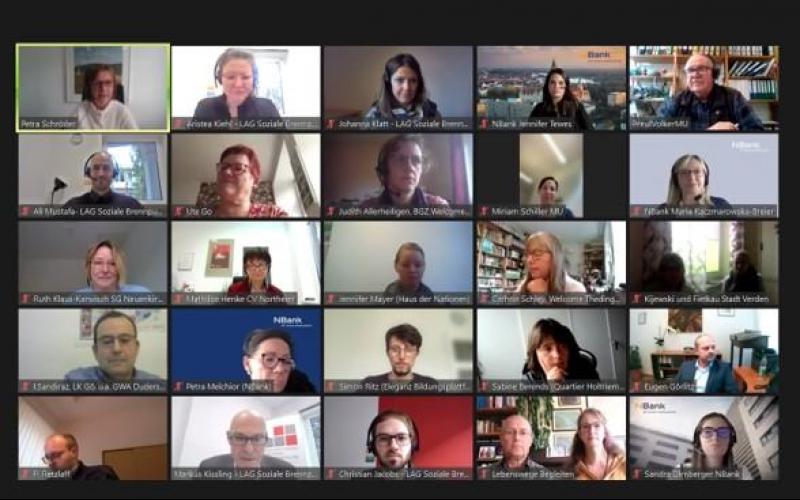 Am Montag, den 26.09.2022, fand das erste "Arbeitstreffen der 2022 geförderten Projekte" online statt. Alle im Wettbewerb "Gute Nachbarschaft 2022" ausgewählten Projekte waren vertreten, häufig in mehrfacher Besetzung. Ebenfalls mit von der Partie waren das Niedersächsische Ministerium für Umwelt, Energie, Bauen und Klimaschutz, die Kolleginnen und Kollegen von der NBank und der LAG als Servicestelle.