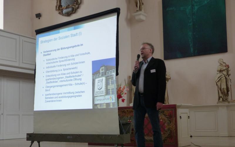 Den forschungsbasierten Aufschlag machte Dr. Thomas Franke vom Deutschen Institut für Urbanistik aus Berlin. Aus dem "Fundus" der Erfahrungen des Leitprogramms der Städtebauförderung, Soziale Stadt, schöpfte er, und stellt dabei die beiden Ziele der "sozialen Stadt" und "Sozialen Stadt" einander gegenüber: