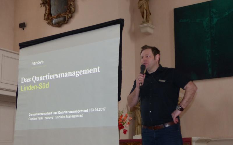 Carsten Tech, aus dem Veranstaltungsort nahe gelegenen Quartier Linden-Süd eingetroffen, präsentierte ein urbanes Beispiel gelungenen Quartiersmanagements - und damit wie sich  die Arbeit vor Ort multiplizieren und eine ungemeine Strahlkraft entfalten kann:
