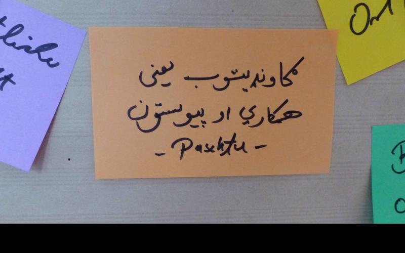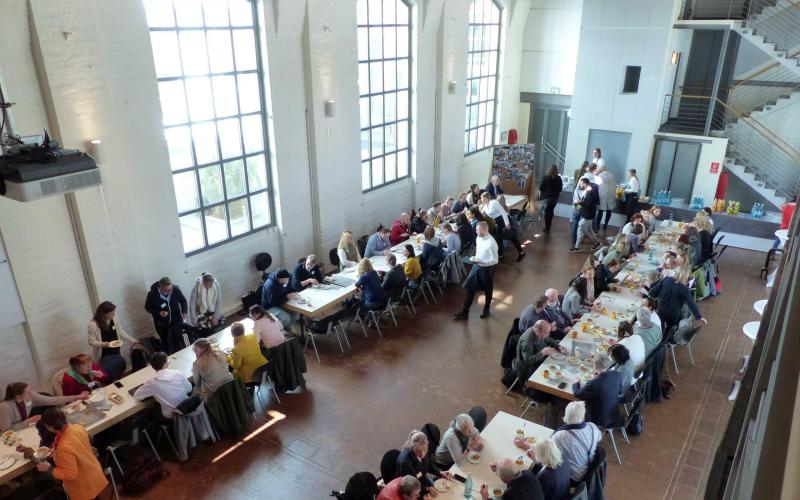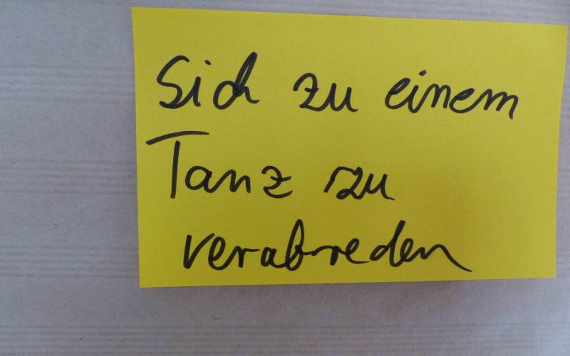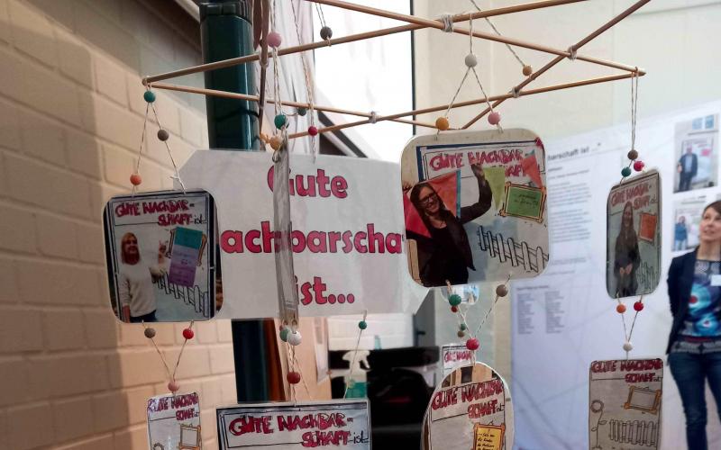 Beim Mittagessen an zwei langen Tafeln konnte der Austausch - auch anhand von mitgebrachten Fotos - fortgesetzt werden, hier kamen die Teilnehmenden des BITs auch wieder dazu. In der großen Halle waren nun verschiedene Aktivitäten möglich, die Wirkung von GWA zu zeigen: in verschiedenen Techniken konnte der Satz "Gute Nachbarschaft ist..." ergänzt werden: als Video-Beitrag und mit einem Klebezettel auf einer Beteiligungswand. Im sonnigen Hof konnte das Spiel "SPIELRAUM für gute Nachbarschaft" erprobt werden. Alle Aktivitäten waren somit auch ein Beitrag für die Fotoausstellung im Landtag, ebenso, wie die von den Projekten mitgebrachten oder beim BIT entstandenen Fotos.