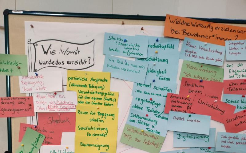 In Workshops am Vormittag wurde es dann konkret und gesammelt, welche Wirkungen die GWA auf die Bewohner*innen, den Sozialraum, die Kommune und auf Landesebene erzielt, aber auch, welche Stolpersteine überwunden werden müssen.