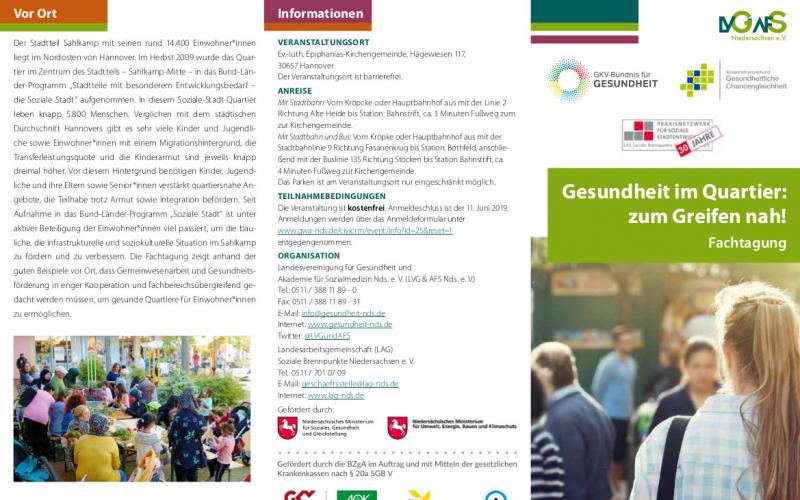 Die Beantwortung dieser und weiterer Fragen steht im Fokus der Fachtagung vor Ort „Gesundheit im Quartier: zum Greifen nah!“, die von der Landesvereinigung für Gesundheit und Akademie für Sozialmedizin Niedersachsen e. V. in Kooperation mit der Landesarbeitsgemeinschaft Soziale Brennpunkte Niedersachsen e. V. veranstaltet wird.