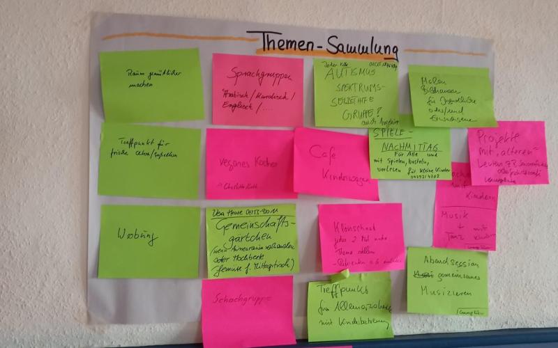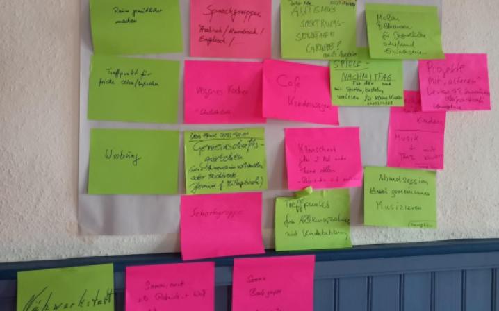 Nach persönlicher Vorstellung (Kurzbiografie, Interessen und Motivation) wurden zunächst ohne Struktur und Vorgaben Erfordernisse, Ziele und Ideen für eine Gemeinwesenarbeit im Allgemeinen, für das Gemeinschaftszentrum "Haus am Markt" im Speziellen gesammelt. Alle Punkte wurden anschließend geclustert und dazu kleine Arbeitsgrupppen für die weitere Ausgestaltung gebildet. Am Ende haben die Sprecher*innen jeder Arbeitsgruppe die Ergebnisse dem Plenum vorgetragen und um Fragen, Ergänzungen gebeten. Der Nachmittag endete mit konkreten Verabredungen innerhalb der Arbeitsgruppen für die anschließenden Wochen.