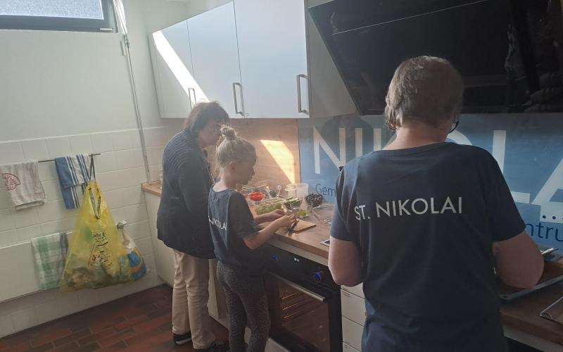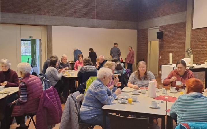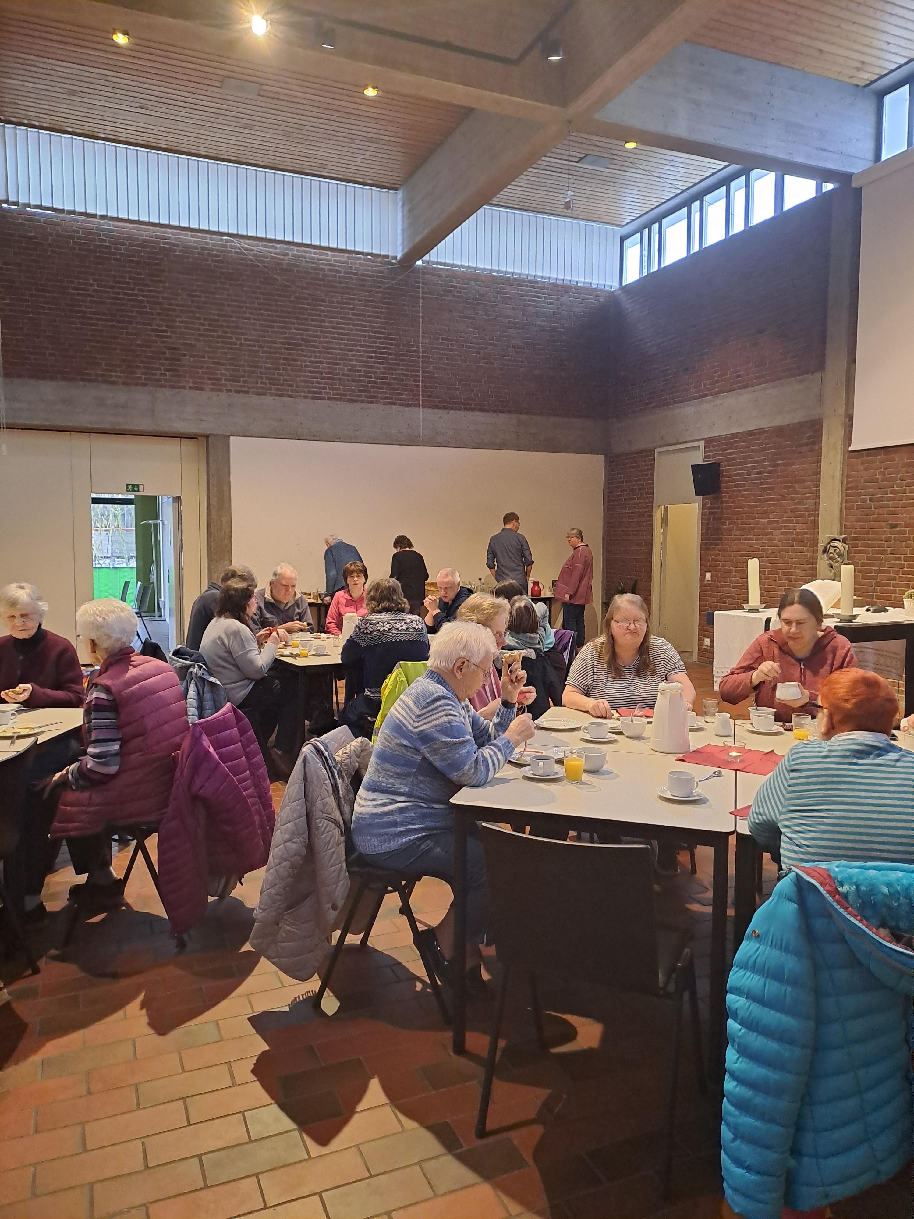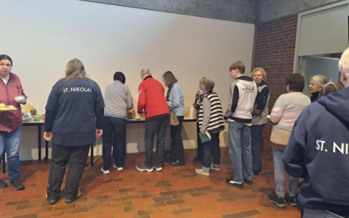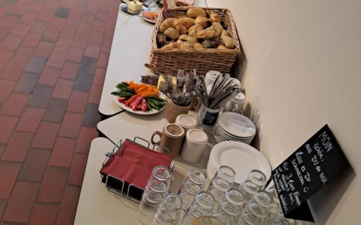 Ein Team aus Haupt- und Ehrenamtlichen bereitet gemeinsam ein Frühstücksbuffet vor. Es werden Gruppentische mit Platz für 8 Personen gestellt. Das Motto ist: Man kann alleine kommen, aber man muss nicht alleine essen. Die Ehrenamtlichen arbeiten in der Küche inzwischend weitgehend selbstständig, der Fokus des Hauptamts liegt auf der Anregung der Kommunikation zwischen den Nachbarn. Wir schaffen Gesprächsanlässe. Das Angebot läuft auf Spendenbasis, die Einnahmen fließen komplett in den nächsten Einkauf. Jede:r zahlt was er/sei kann und möchte.