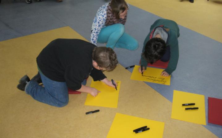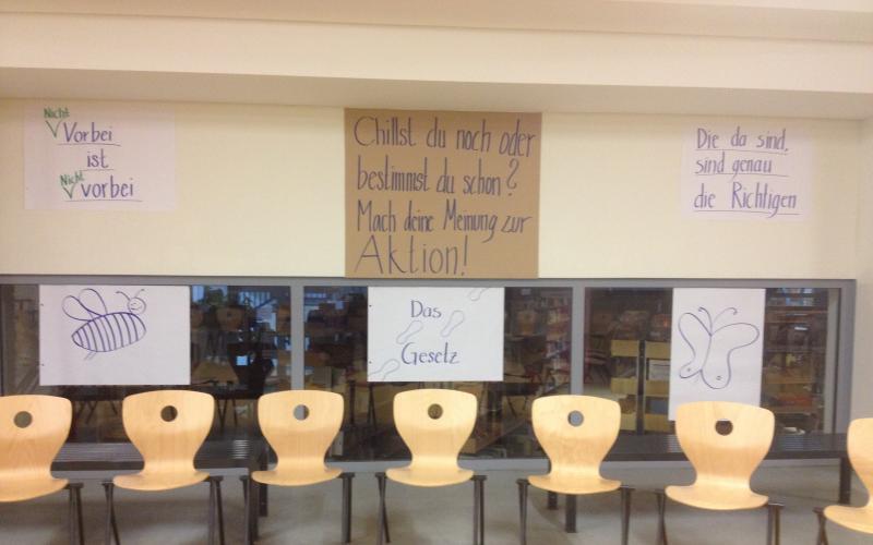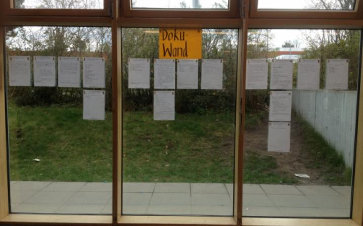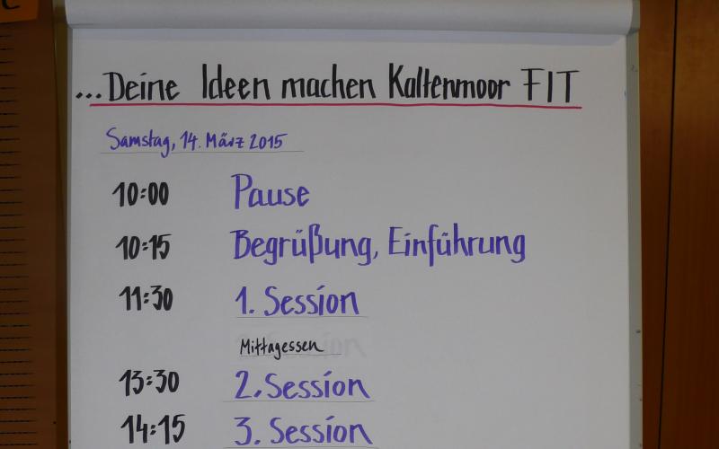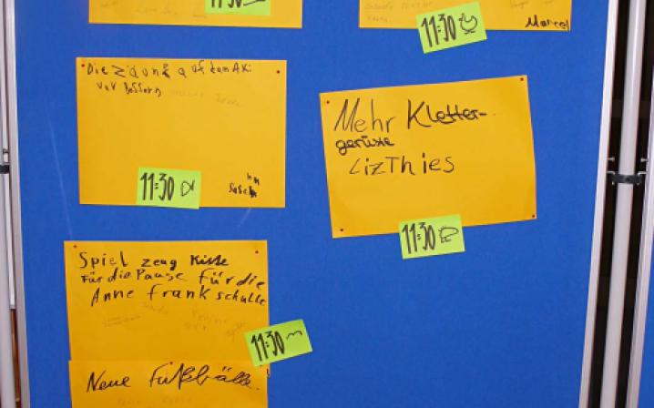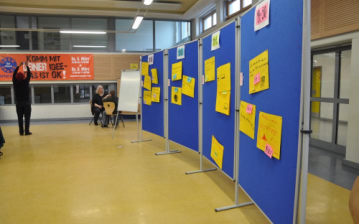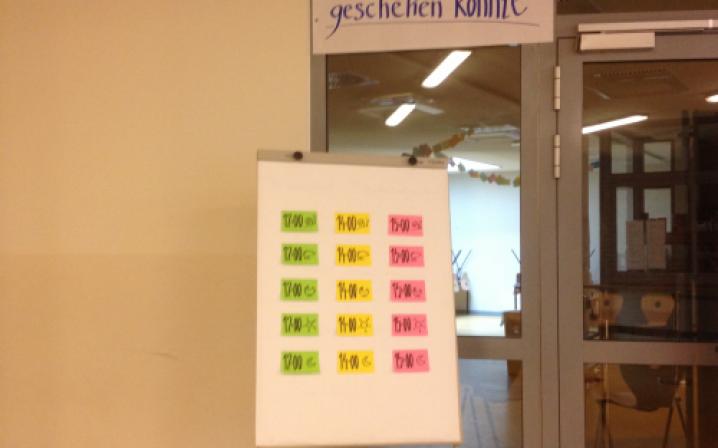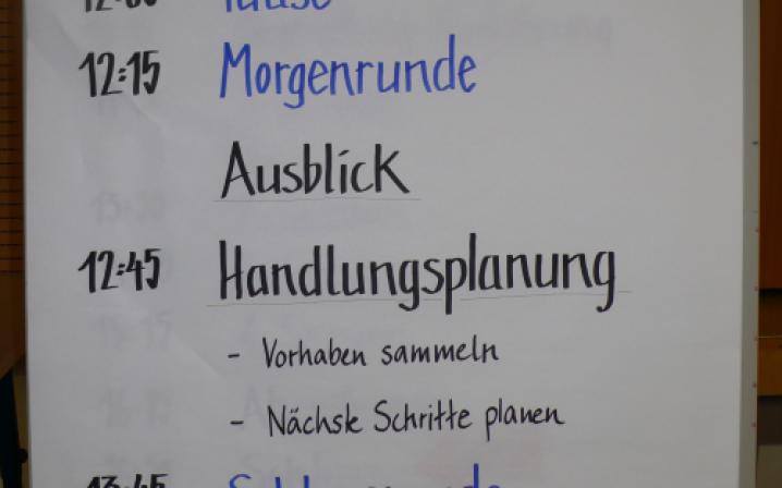 > Aufforderung zur Themensammlung. Jeder TN, der ein konkretes Thema vorträgt, schreibt es auf ein Blatt und bringt dieses an der Zeit- + Raumtafel an.Hier legt er „Raum + Zeit“ der Themenarbeit fest, wo +wann sich die Gruppe mit am Thema interessierten TN trifft.In der Gruppensitzung werden zu dem Thema Ideen, Maßnahmen + Ziele entwickelt. Die Gruppen halten ihre Arbeit in Protokollen fest, Aushang dieser an einer Nachrichtenwand.