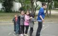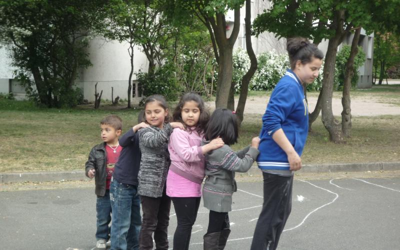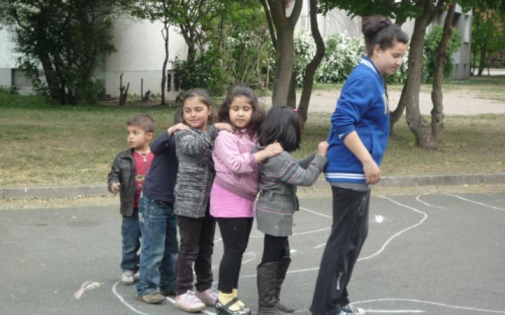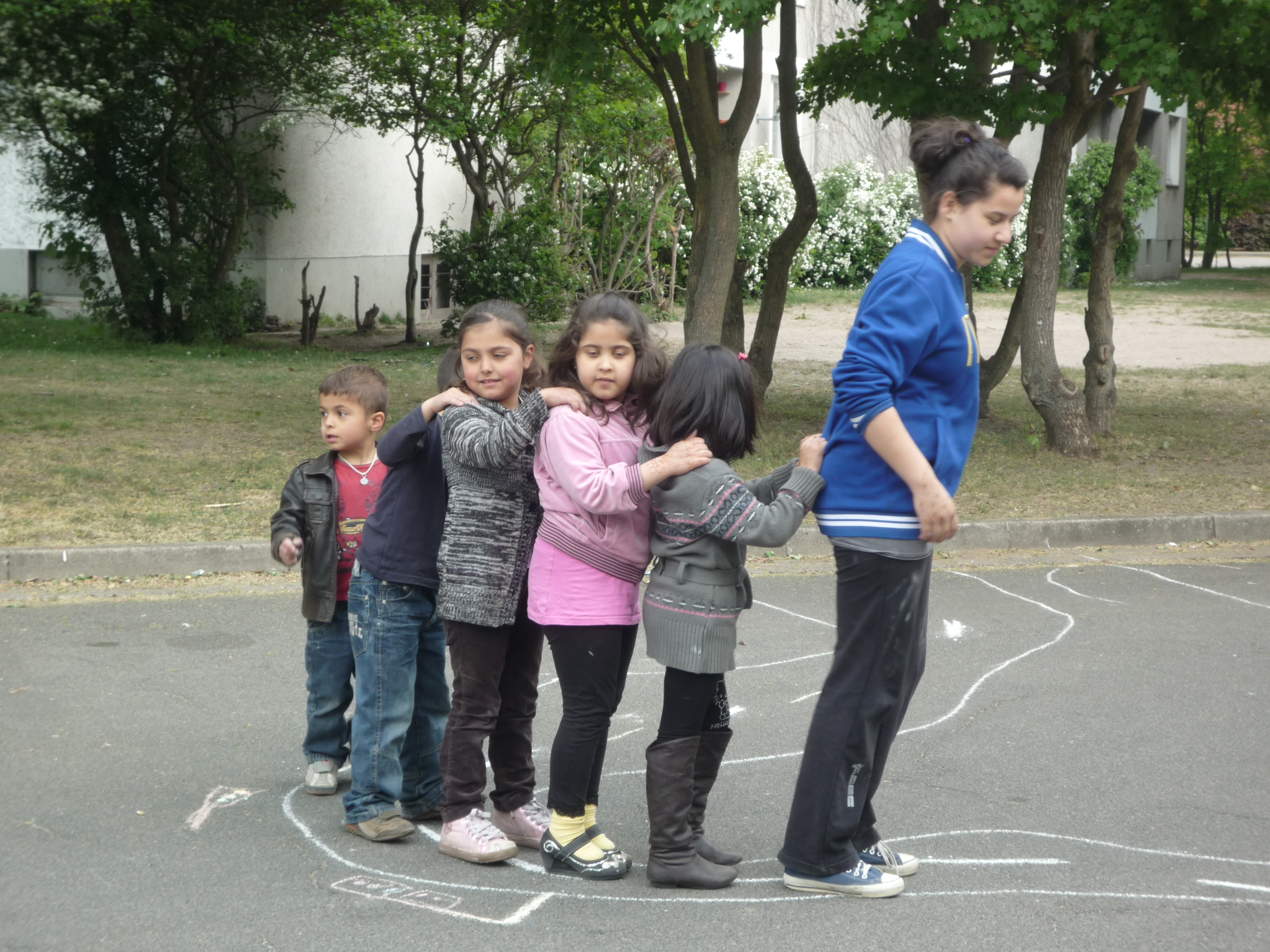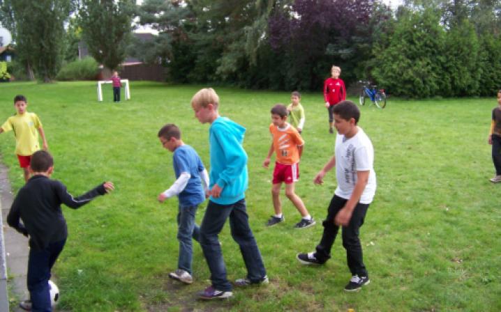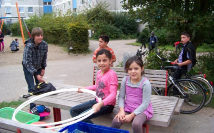 Einmal in der Woche kommen die Honorarkräfte, die selber in der Siedlung wohnen, mit den Spielgeräten in die Freiflächen der Siedlung. Dort geben sie die Geräte aus, bauen auf und leiten an. Zusammen mit den Kindern werden nach ca. 2,5 Stunden die Spiele wieder eingeräumt und in einem Kellerraum verstaut. Bei einem Nachmittag kommen zwischen 20 und 50 Kinder zusammen. Den Spieleverleih setzen wir auch in der Kooperation mit dem Konfirmandenunterricht der Kirche ein. Konfirmanden aus anderen Stadtteilen kommen hierher, um einen Nachmittag hier im Viertel zu gestalten.